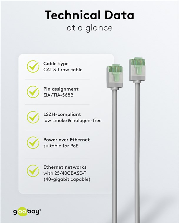 - Supercienki kabel LAN z bardzo krótkimi złączami RJ45 zapewnia mniejszą objętość kabla w szafie serwerowej lub panelu krosowym, a tym samym optymalną cyrkulację powietrza