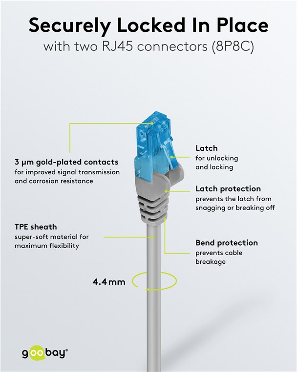 - Pewne zatrzasnięcie: Osłona zatrzasku na wtyczce RJ45 zapobiega zaczepianiu się lub odłamaniu zatrzasku