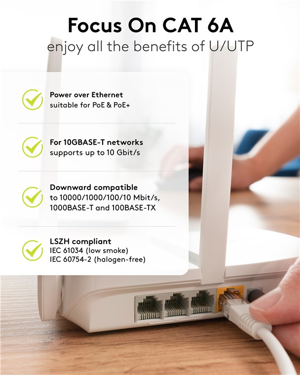 - Szybki, szybszy, CAT 6A: Jako kabel sieciowy CAT 6A odpowiedni do 10-Gigabit Ethernet 10BASE-T, 100BASE-TX, 1000BASE-T, 10/100/1000/10000 Mbit/s