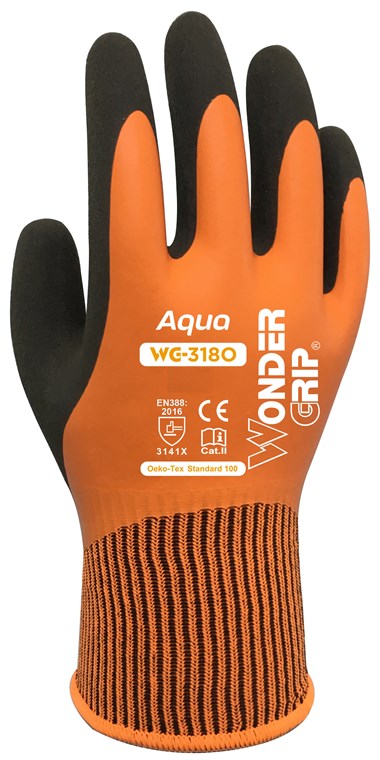 WG-318O Aqua to podwójna, w pełni powlekana rękawica lateksowa z 13-stopniową nylonową wyściółką. Dzięki technologii Wonder Grip® Technology™ powłoka ta zapewnia niezrównaną przyczepność i wytrzymałość w suchym i mokrym środowisku. WG-318O Aqua jest w 100% wodoodporny i utrzymuje ręce użytkownika w suchych i wygodnych warunkach. Pod względem przyczepności i elastyczności jest to nasza preferowana rękawica do pracy w mokrym środowisku. Gwarantuje komfort i przyczepność przy jednoczesnym zachowaniu doskonałej elastyczności.