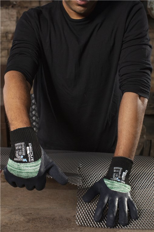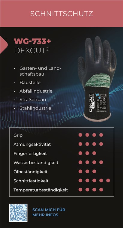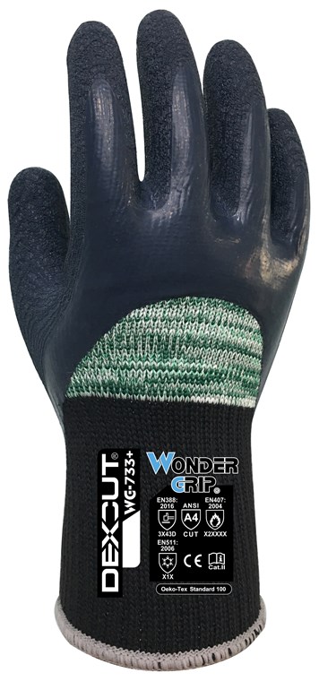 Dexcut® WG-733+ jest przeznaczony do ciężkich prac w suchym lub lekko zaolejonym środowisku, w którym występuje średnie lub duże ryzyko skrawania. Powłoka HDML™, opracowana specjalnie przez Wonder Grip®, zapewnia antypoślizgową powierzchnię, wyjątkowe właściwości przeciwzużyciowe i podwójną ochronę przed zagrożeniami termicznymi. Kompleksowa ochrona naszej wyjątkowej rękawicy WG-733+ sprawia, że jest to doskonała rękawica do wszechstronnego stosowania w środowiskach półsuchych.
