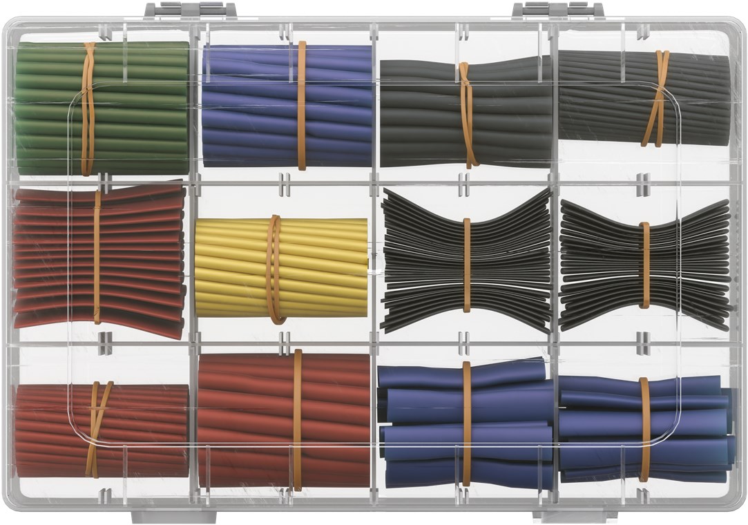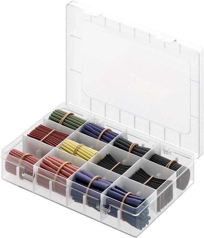 • Zestaw rur termokurczliwych jest dostarczany w przejrzystym plastikowym pudełku z praktycznym uchwytem do zawieszania i nadrukowanym spisem treści na wewnętrznej stronie pokrywy