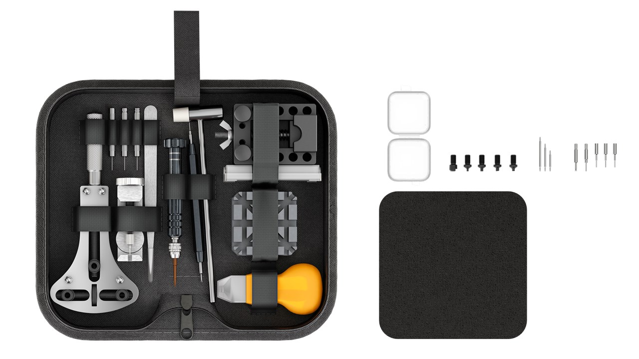 - Akcesoria i konserwacja: 20x zawleczki do bransoletek ogniwowych, 85x sprężynki w wielu rozmiarach do wszystkich bransoletek, 1x pęseta, 1x precyzyjny śrubokręt z 5x końcówkami (niemagnetyczny), 1x ściereczka do czyszczenia