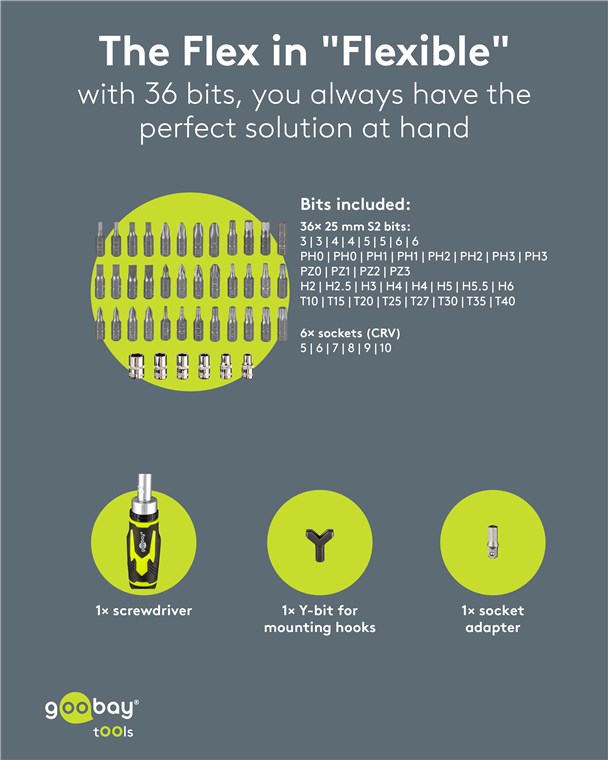 - W zestawie 1x adapter do klucza nasadowego, 6x kluczy nasadowych (5–10 mm, CRV) i 36 bitów z odpornej na uderzenia stali S2: 8x płaski, 12x krzyżakowych (PH, PZ), 8x sześciokątny (H, Hex Pin), 8x sześciokątny (T, TH)