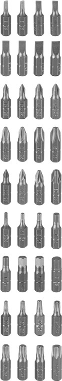 • W zestawie 1x adapter do klucza nasadowego, 6x kluczy nasadowych (5–10 mm, CRV) i 36 bitów z odpornej na uderzenia stali S2: 4x płaski, 8x krzyżakowych (PH, PZ), 12x sześciokątny (H, Hex Pin), 12x sześciokątny (T, TH)