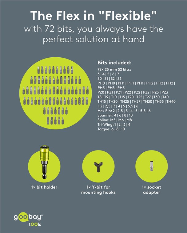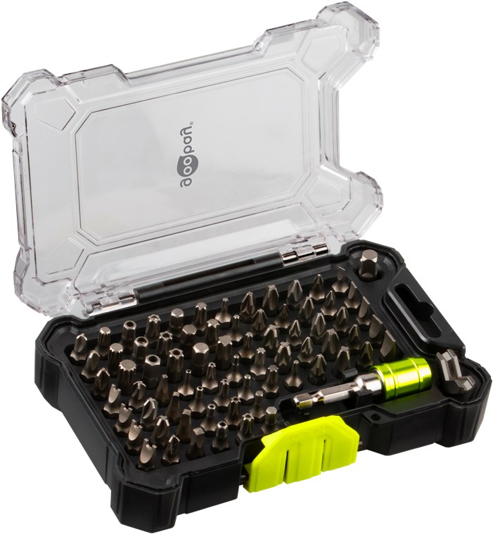 - W zestawie 1x adapter klucza nasadowego, 72 końcówek (CRV): 5x płaski, 19x krzyżakowych (PH, PZ), 4x kKwadrat, 16x sześciokątny (T, TH), 7x sześciokątny (H), 7x sześciokątny, 4x kluczyk (U), 3x spline, 4x tri-wing, 3x torque