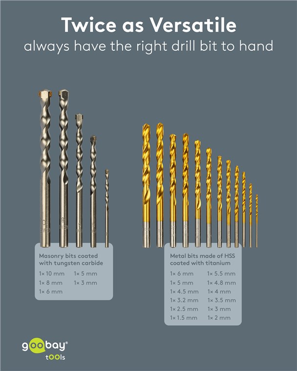 12 wierteł do metalu (6 mm / 5,5 mm / 5 mm / 4,8 mm / 4,5 mm / 4 mm / 3,5 mm / 3,2 mm / 3 mm / 2,5 mm / 2 mm / 1,5 mm), 5 wierteł do kamienia (10 mm / 8 mm / 6 mm / 5 mm / 3 mm), pudełko do przechowywania